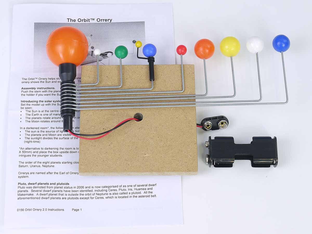 Enkel modell for å demonstrere form og bevegelse til solsystemet. Solen er opplyst med en 6 V lampe som drives av 4 stk 1,5 V batterier (ikke inkludert). Planetene kan bevege seg rundt solen, og månen rundt jorden. Viser planter ut i verdensrommet så langt unna som Neptun.