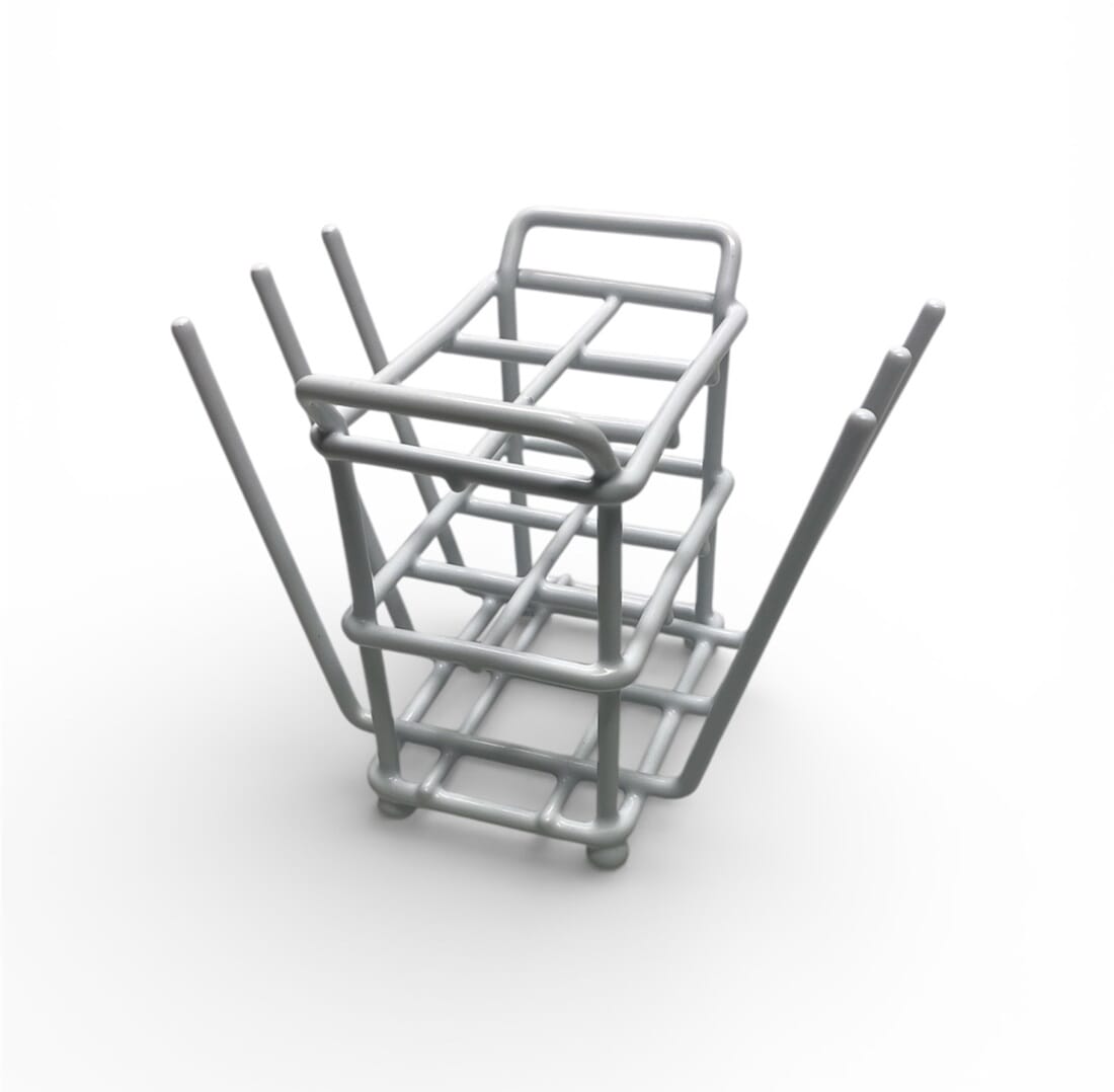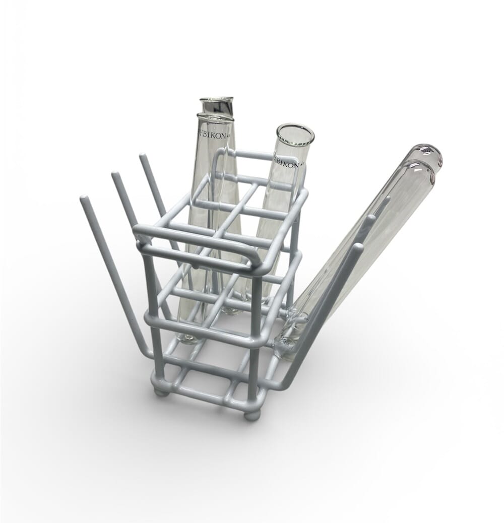 Plastbelagt stativ for 6 reagensrør inntil 24 mm i diameter. Påfestet 6 pinner som kan benyttes til å tørke reagensrørene