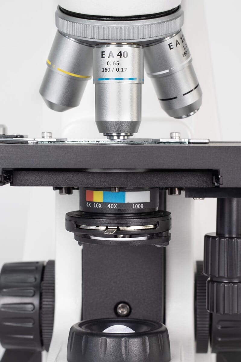 - firedelt objektivrevolver med 4x, 10x, 40x og 100x akromatiske DIN objektiver