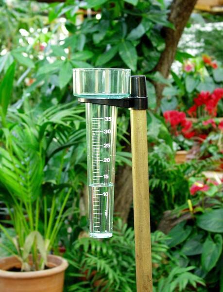 Enkel regnmåler som måler oppsamlet vann i en plastbeholder med gradering for hver milimeter