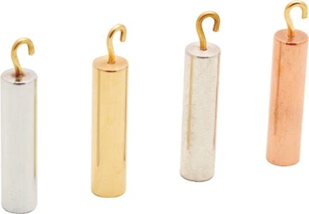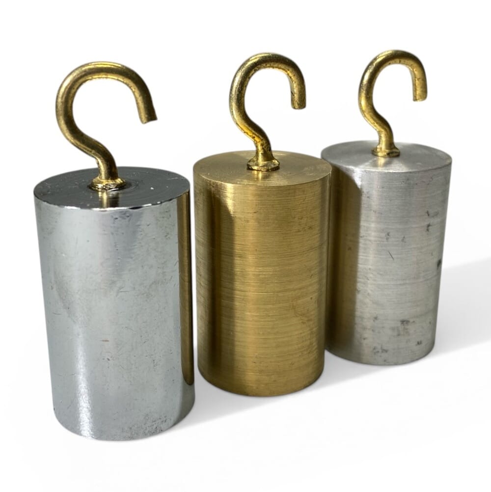 Sett med 3 sylindre med krok. Materiale: messing, stål og aluminium