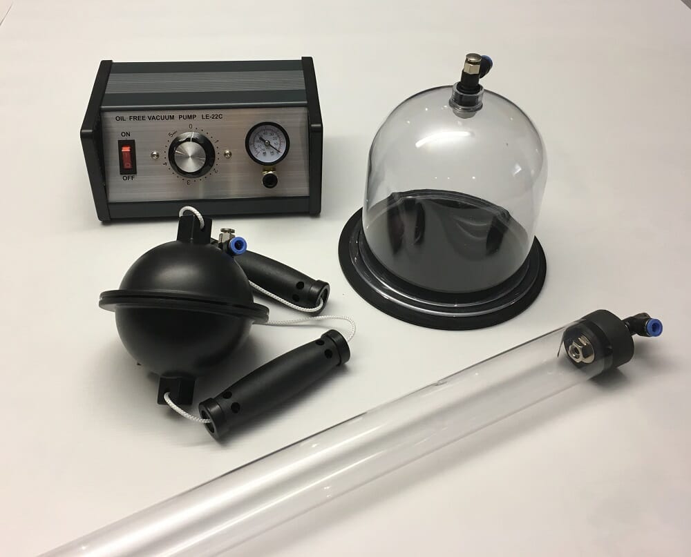 Komplett sett med elektrisk vakuumpumpe (oljefri), vakuumklokke, magdeburske halvkuler og fritt fall rør, samt medfølegende slager for å utføre en rekke morsomme vakuumforsøk.
