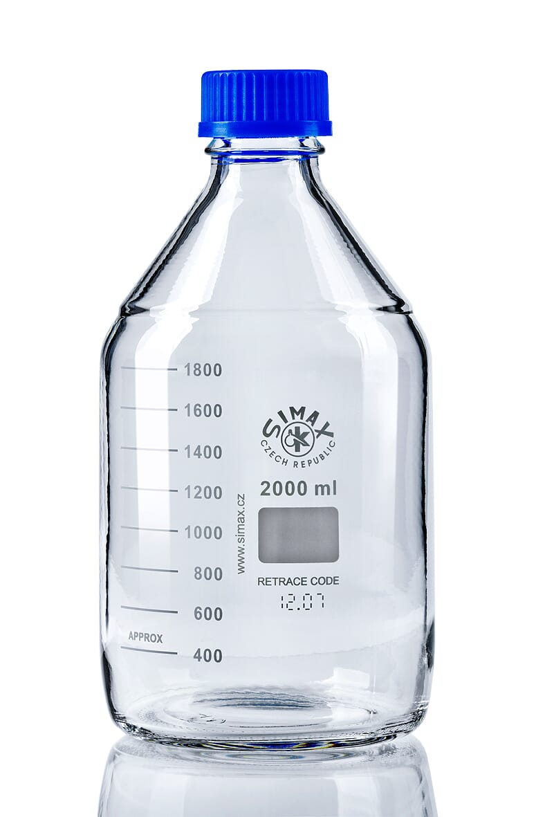Gradert standflaske. Vår anbefaling til oppbevaring av løsninger. Glassflaskene har stor åpning, skrukork, hellekant og skrivefelt.