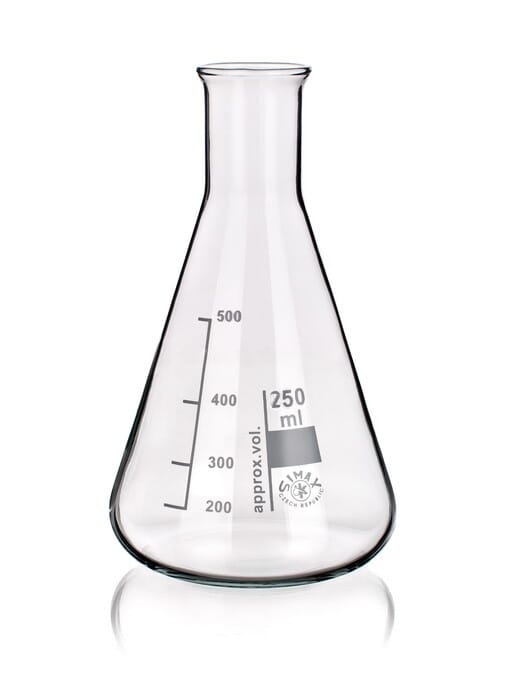 Erlenmeyerkolbe fra Simax i meget god borosilikat glass og med skarp hellekant