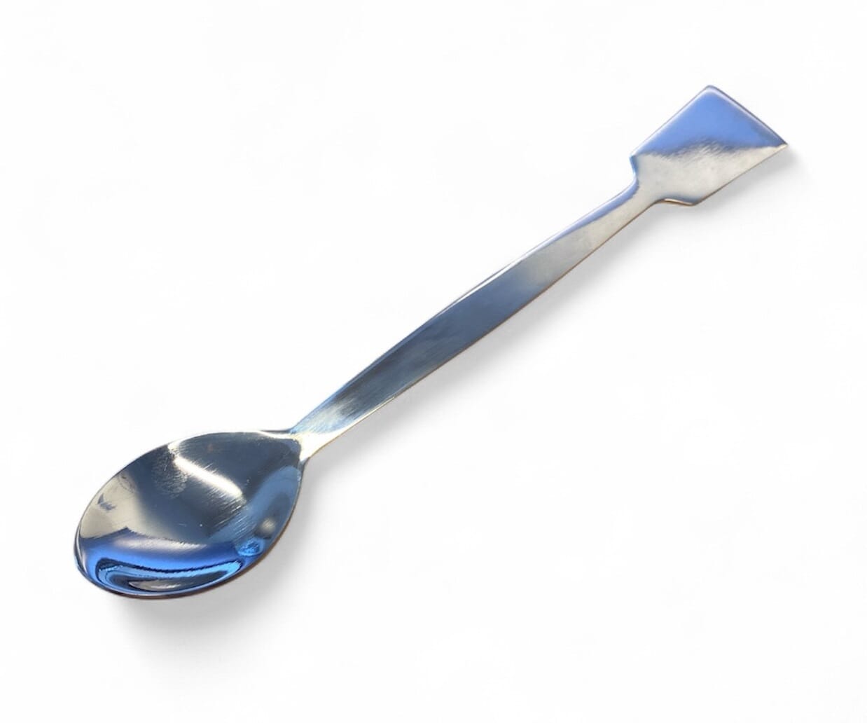 Spatel i rustfritt stål med skje i den ene enden og bred spatel i andre enden. Totallengde 180 mm. Stor og god når det skal tas opp større mengder.