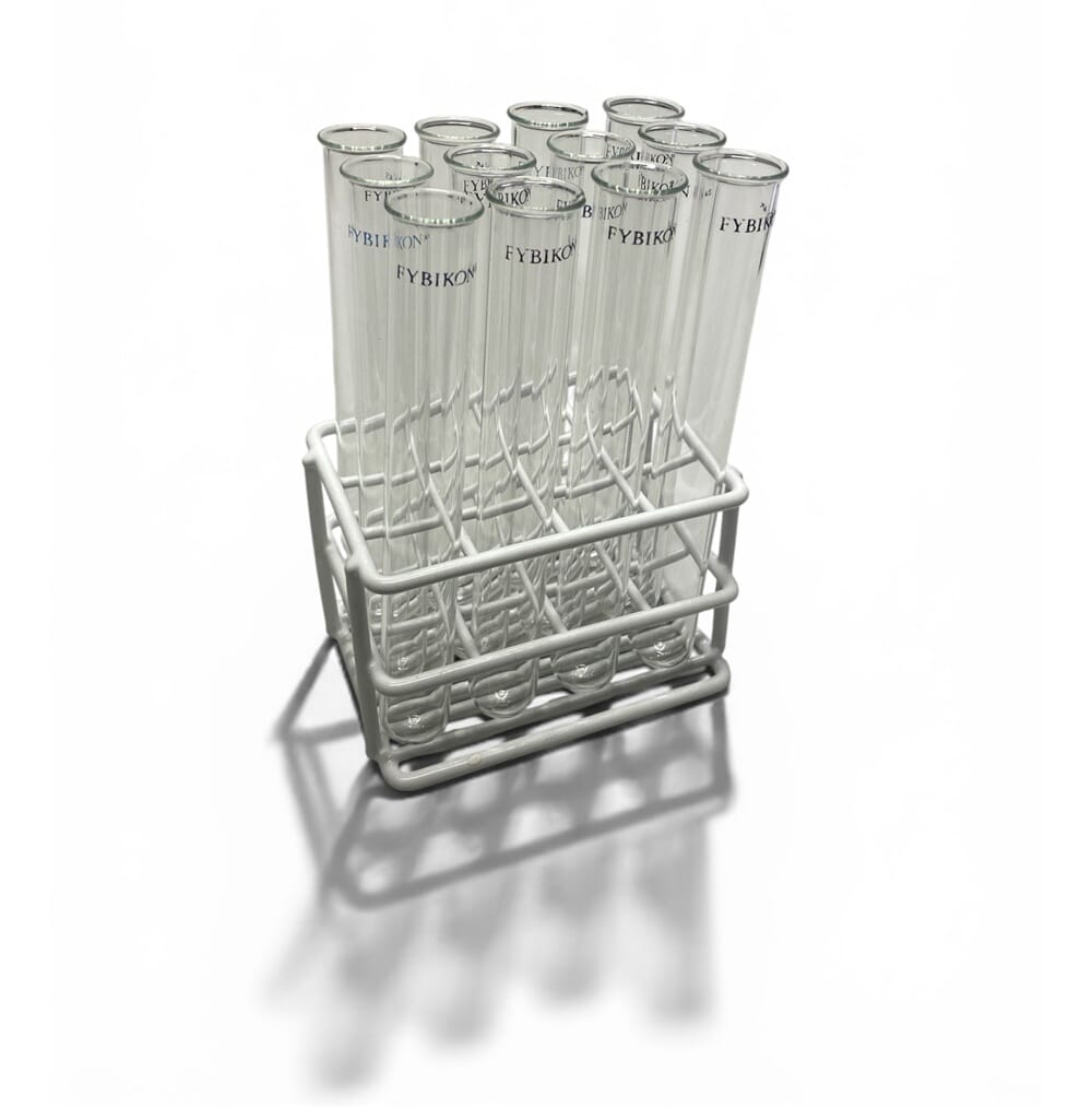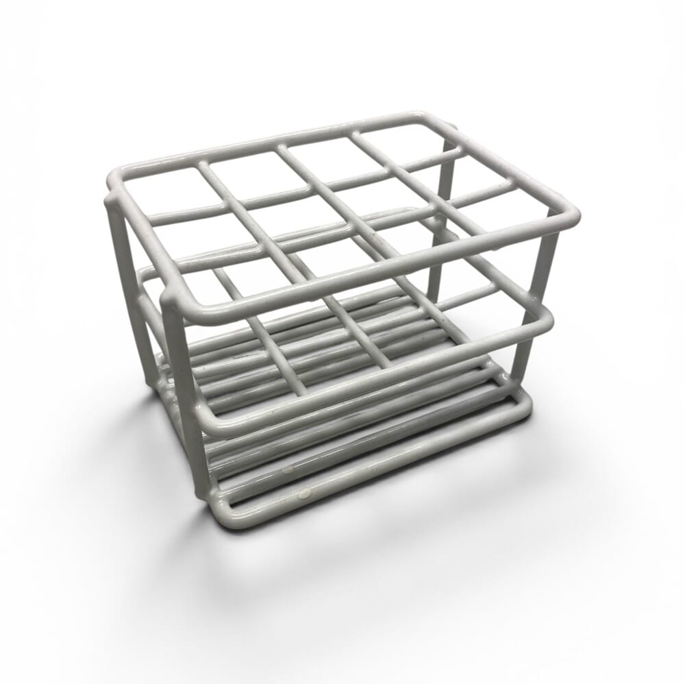 Solid reagensrørstativ av plastbelagt metalltråd med 12 hull. Hullåpning: 20 x 20 mm. Passer til våre mest anbefalte reagensrør i Duran (art. 02119).